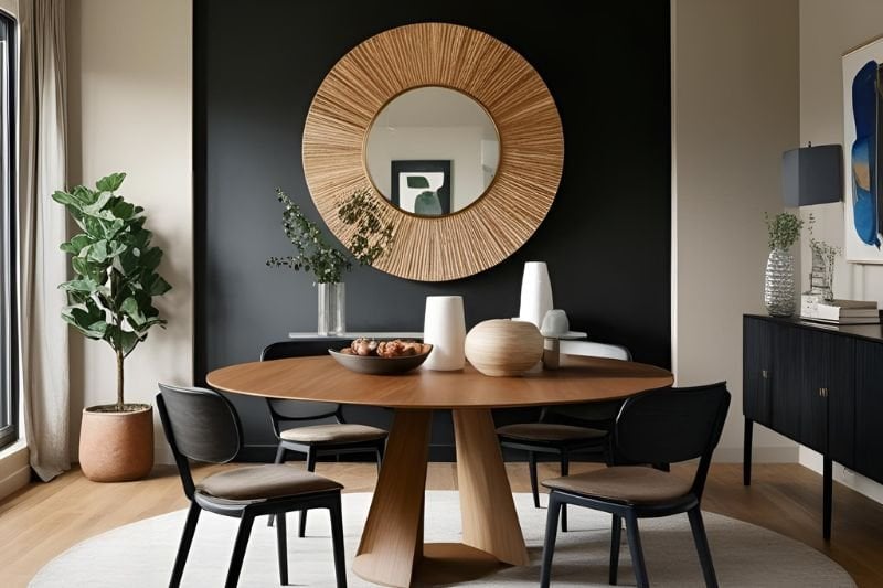Dekorasyon, yuvarlak yemek masasında kolayca yapılabilir. Masanın ortasında veya seçilmiş bir bölümünde, dekoratif objeleri sergileyebilirsiniz. Vazo ve çiçek, kokulu mum veya dekoratif sepet, masada odak noktası olan alanda bulunabilir. Yemek masasını odak noktası yapmanın bir diğer yolu da yuvarlak tasarımlı konsol aynası kullanmak olacaktır. Bu ayna modelleri sayesinde, masanın tasarımı güçlenir ve iç mekanda yuvarlak hatlar öne çıkar. Ayna, yuvarlak yemek masasının aydınlık ve ferah görünmesini de sağlar.