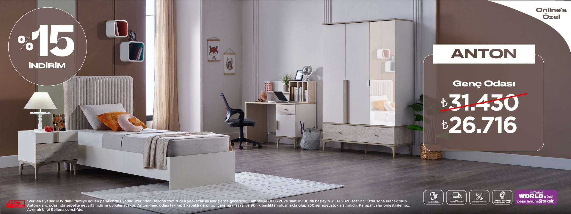 Kampanya 1 Ocak-31 Mart 2026 tarihleri arasında tavsiye edilen KDV dahil perakende fiyatlar üzerinden geçerlidir. Andera genç odası takımında %20, Boheems genç odası takımında %10 indirim uygulanmıştır.