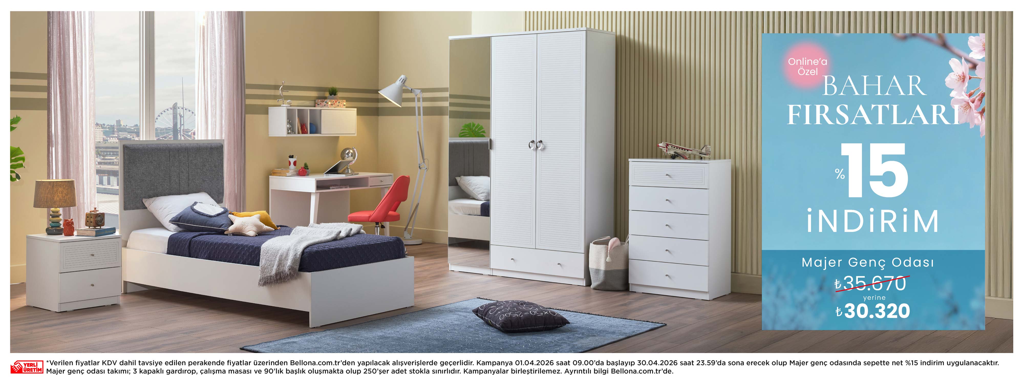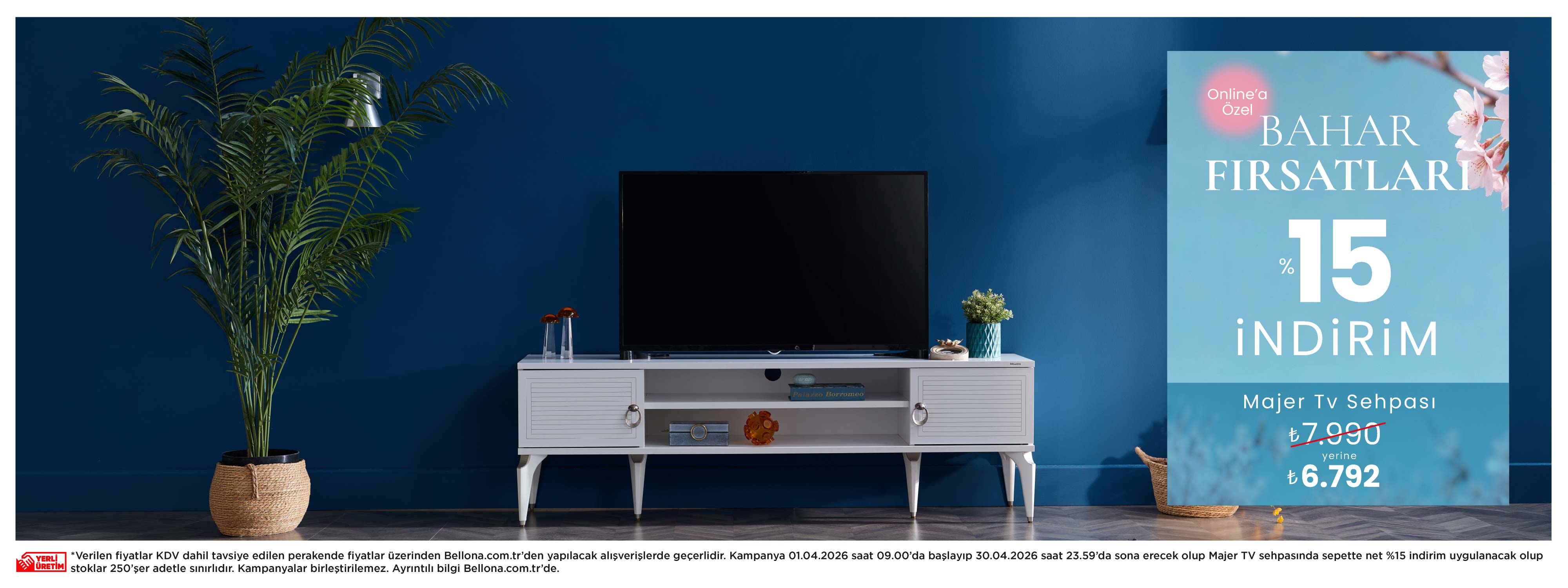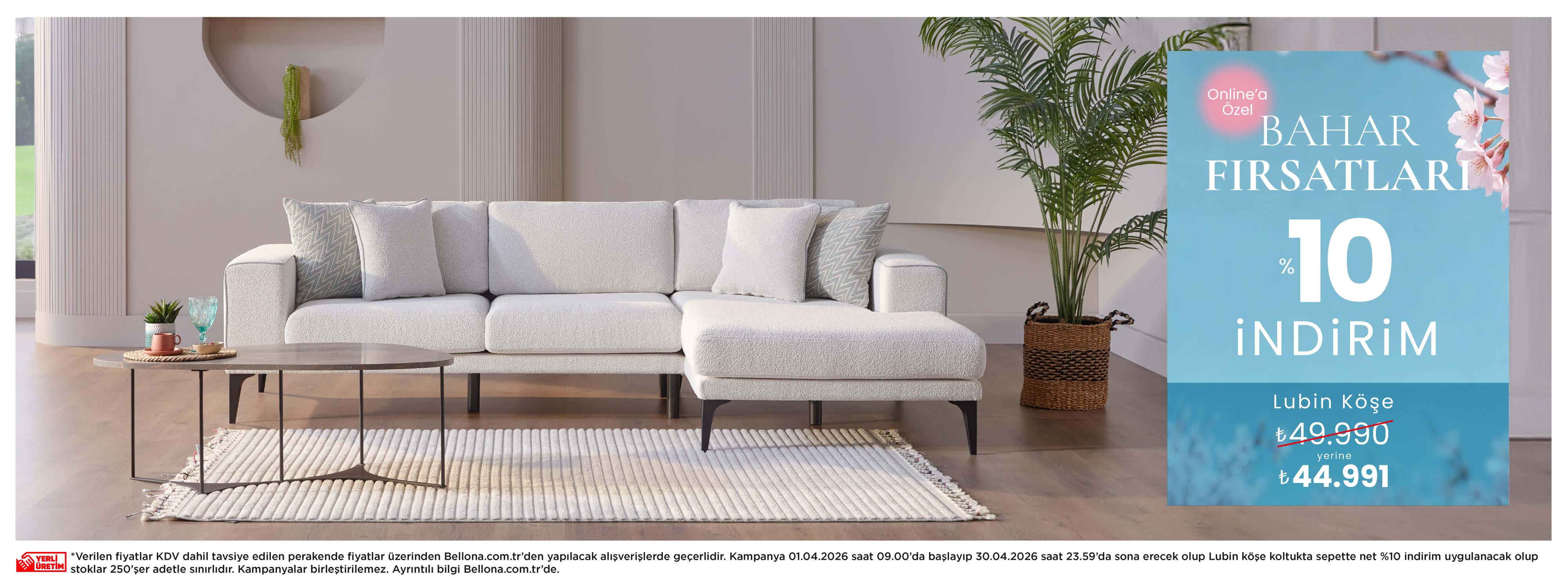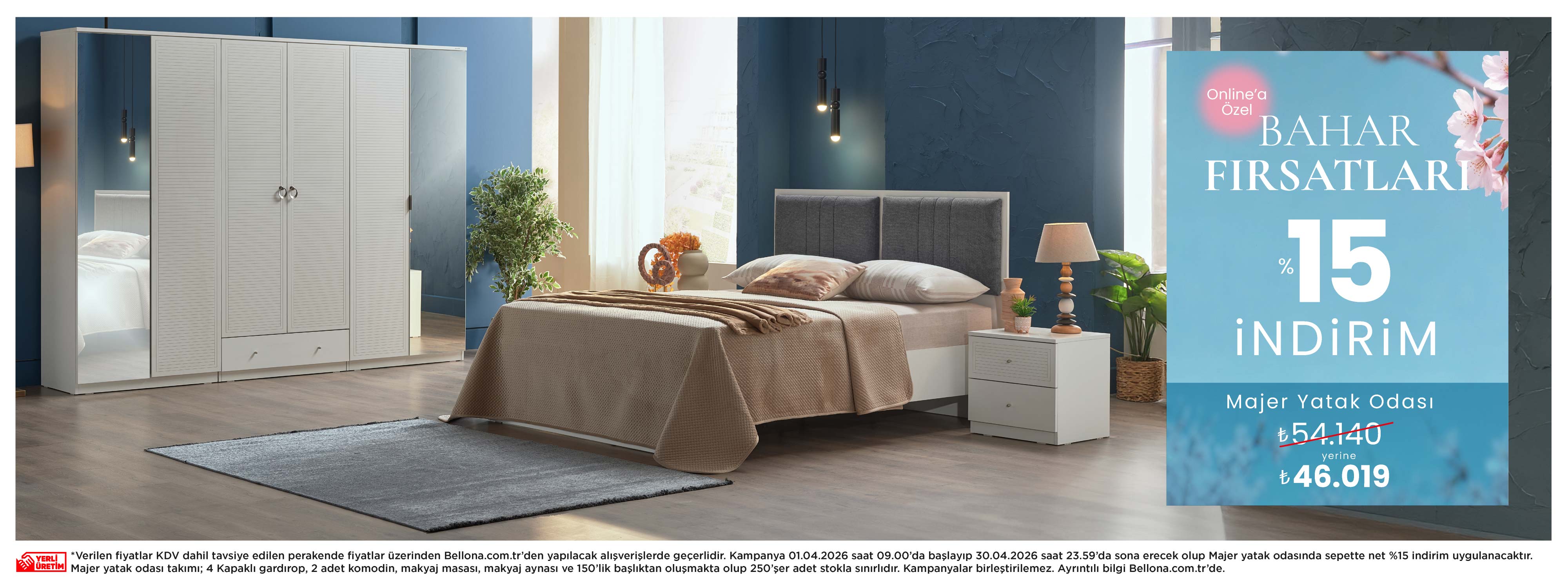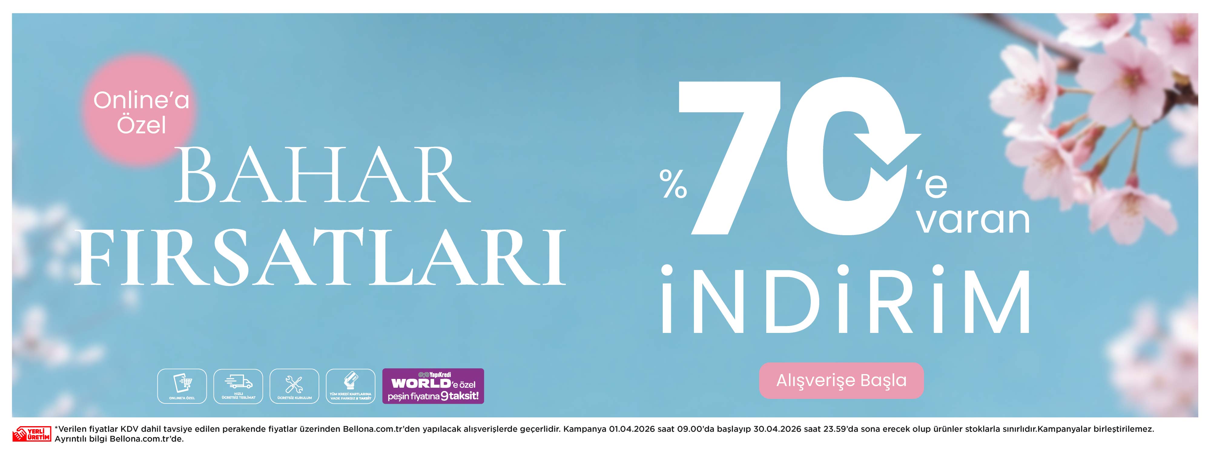 Kampanya 1 Nisan- 15 Mayıs 2026 tarihleri arasında tavsiye edilen KDV dahil perakende fiyatlar üzerinden geçerlidir. Bellona markalı ürünlerden tek seferde 99.000 TL ve üzeri alışverişlerde anında %10 indirim uygulanacaktır. Online’a özel ürünler kapsam dışıdır.