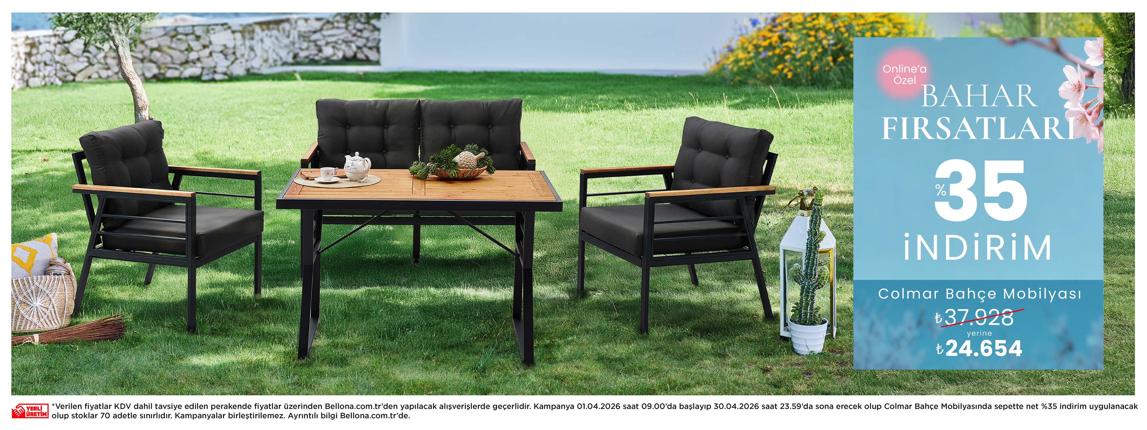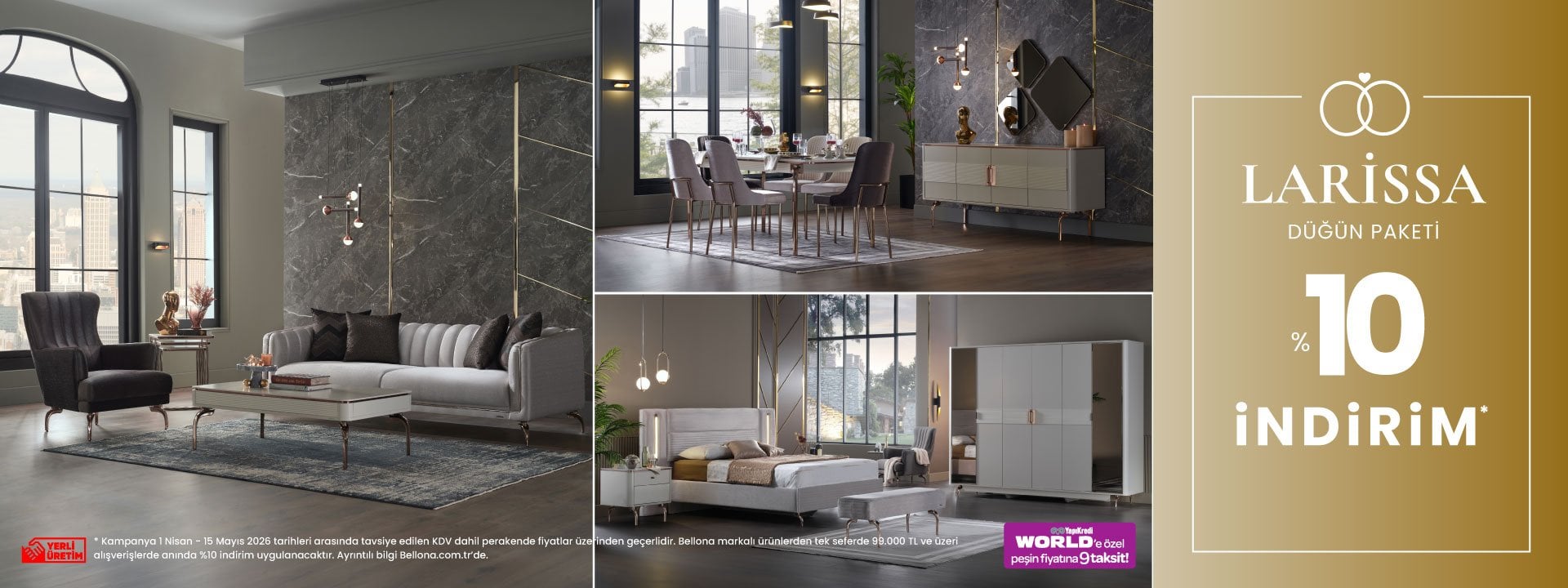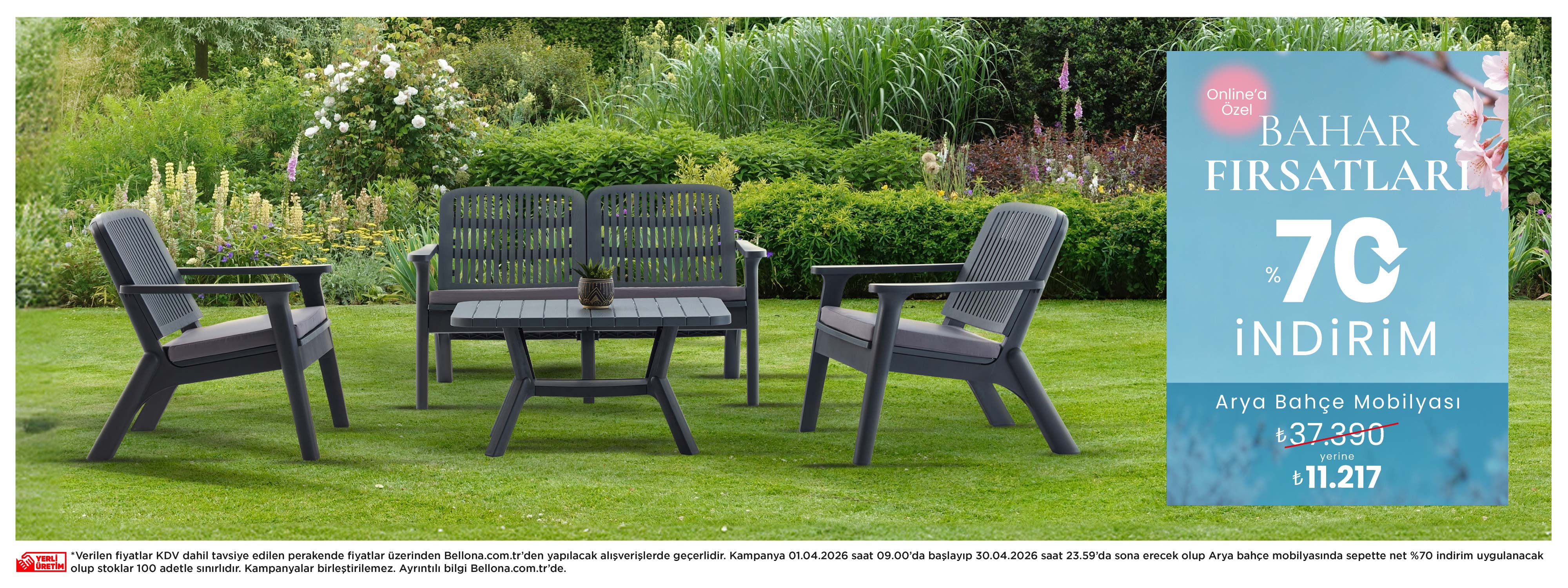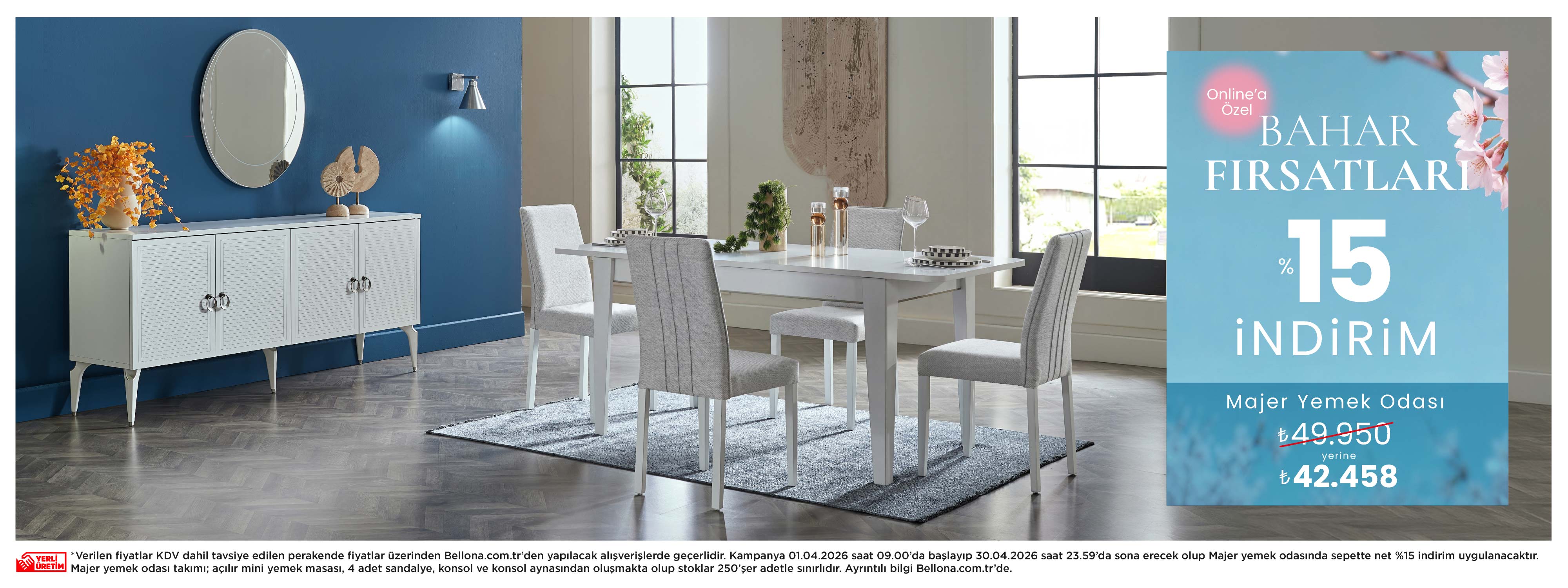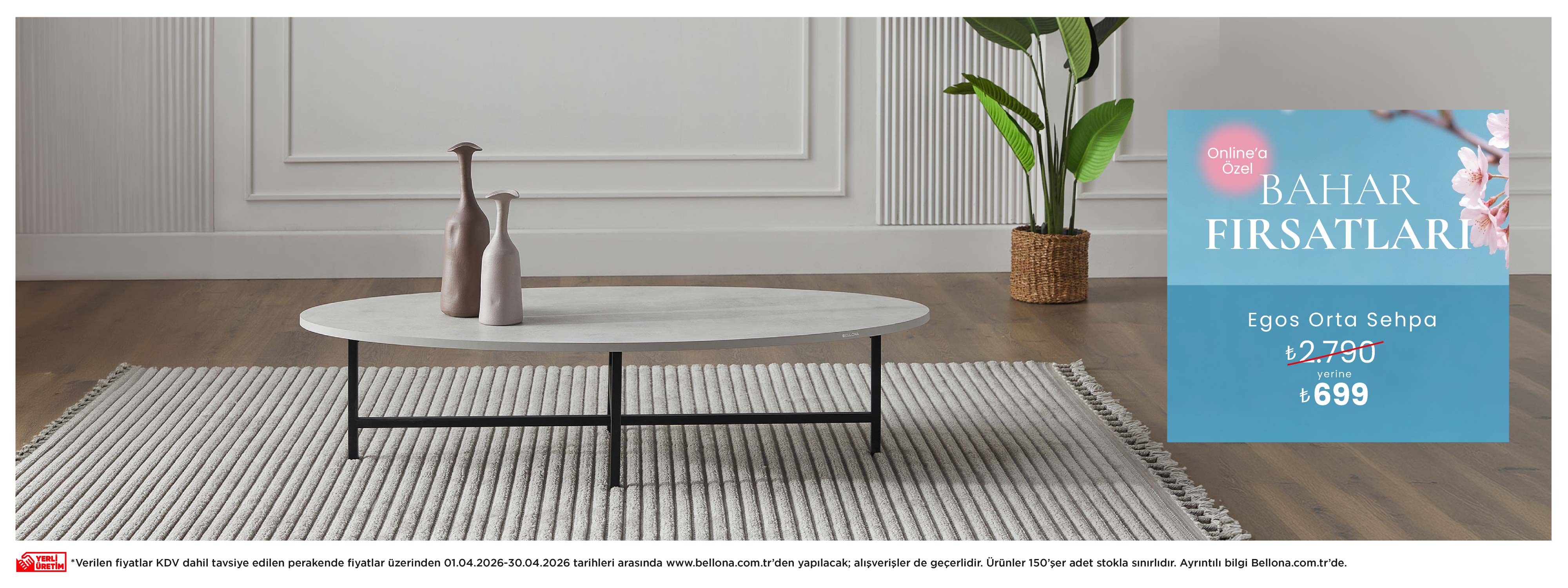 Kampanya 1 Nisan- 15 Mayıs 2026 tarihleri arasında tavsiye edilen KDV dahil perakende fiyatlar üzerinden geçerlidir. Bellona markalı ürünlerden tek seferde 99.000 TL ve üzeri alışverişlerde anında %10 indirim uygulanacaktır. Online’a özel ürünler kapsam dışıdır.