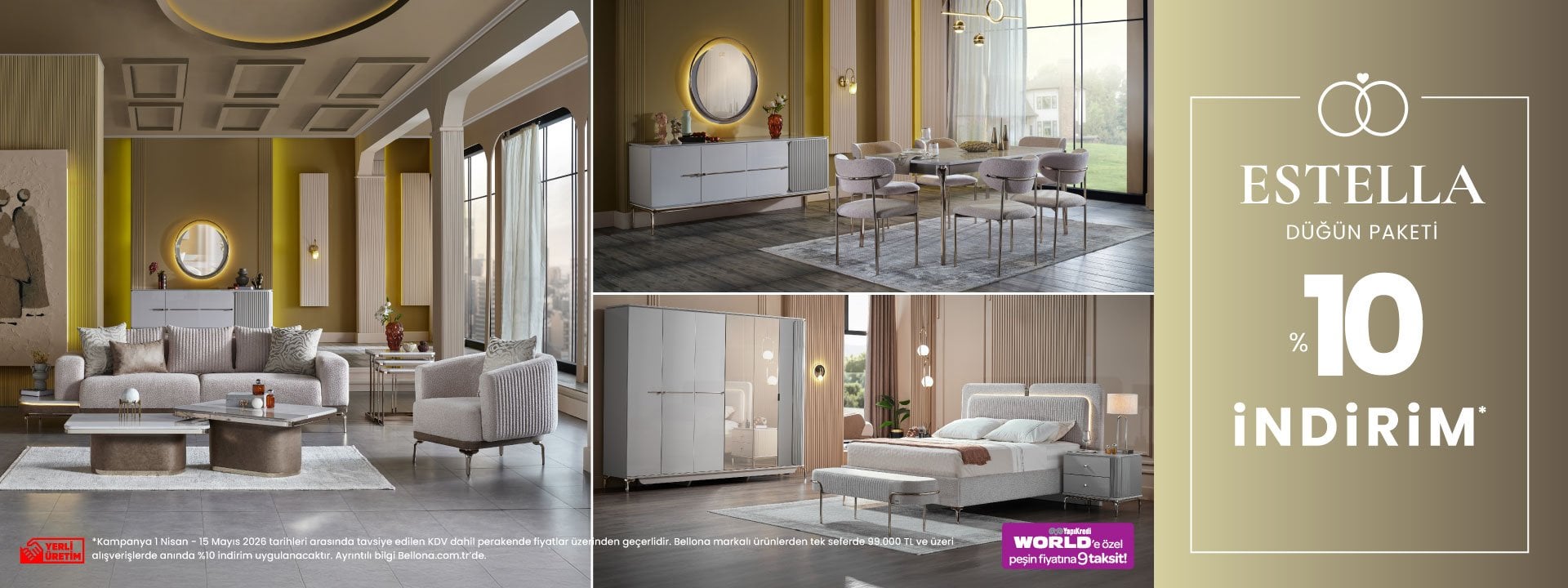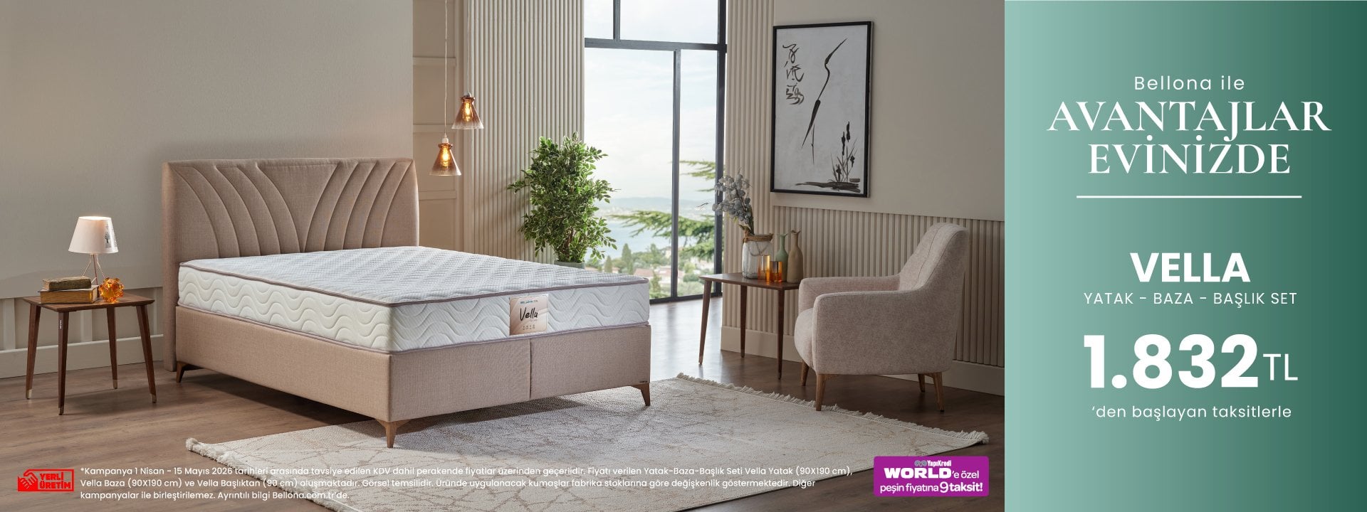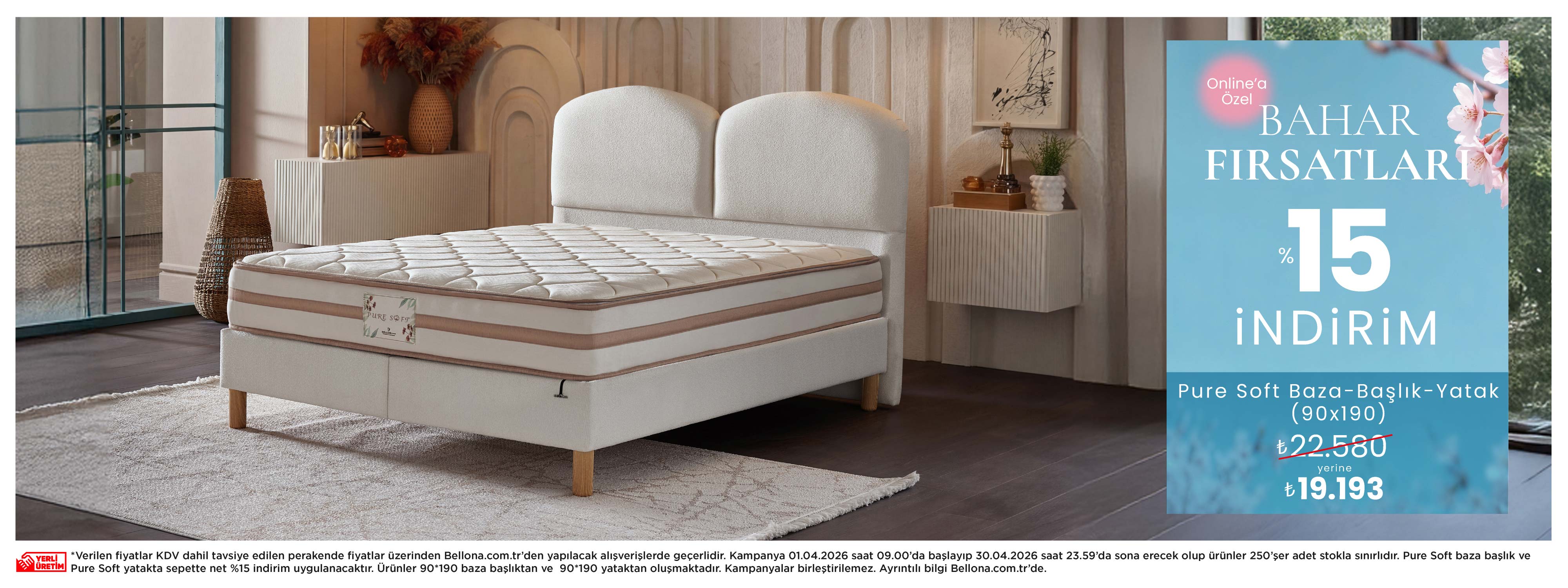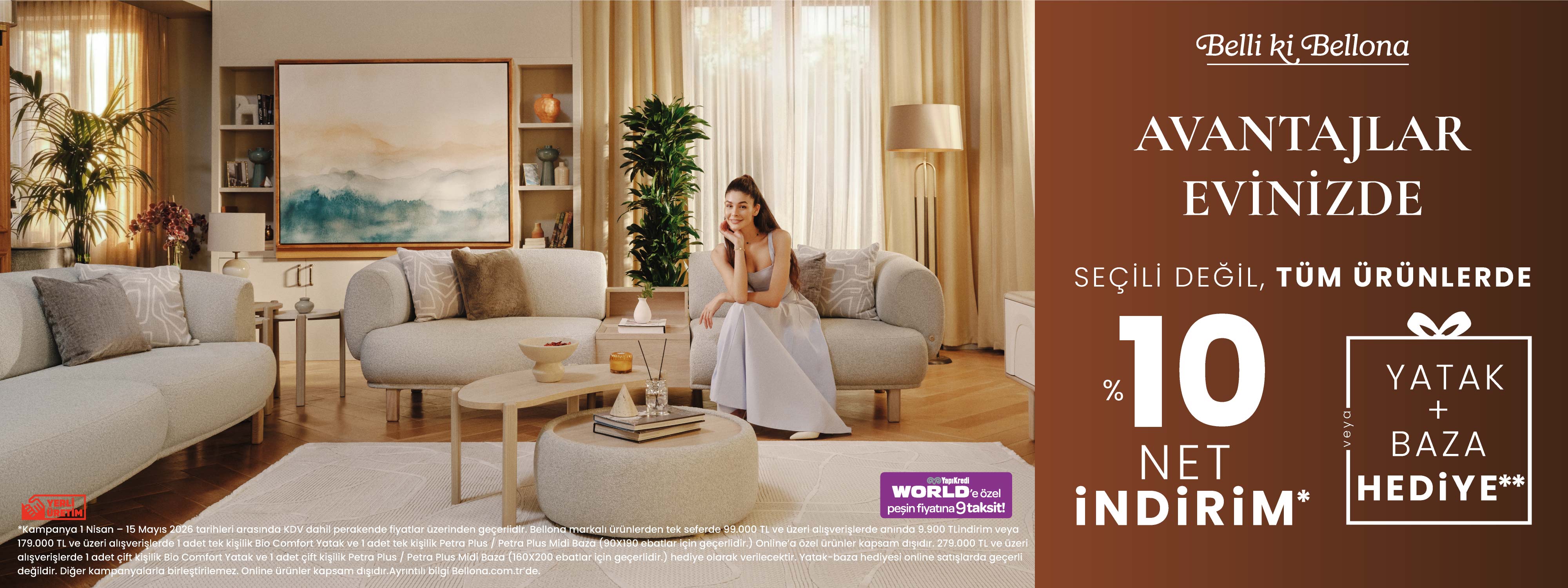 Kampanya 1 Nisan – 30 Haziran 2026 tarihleri arasında KDV dahil perakende fiyatlar üzerinden geçerlidir. Bellona markalı ürünlerden tek seferde 99.000 TL ve üzeri alışverişlerde anında (%10) 9.900 TL indirim veya 179.000 TL ve üzeri alışverişlerde 1 adet tek kişilik Bio Comfort Yatak ve 1 adet tek kişilik Petra Plus / Petra Plus Midi Baza (90X190 ebatlar için geçerlidir.) Online'a özel ürünler kapsam dışıdır. 279.000 TL ve üzeri alışverişlerde 1 adet çift kişilik Bio Comfort Yatak ve 1 adet çift kişilik Petra Plus / Petra Plus Midi Baza (160X200 ebatlar için geçerlidir.) hediye olarak verilecektir. Yatak-baza hediyesi online satışlarda geçerli değildir. Diğer kampanyalarla birleştirilemez.