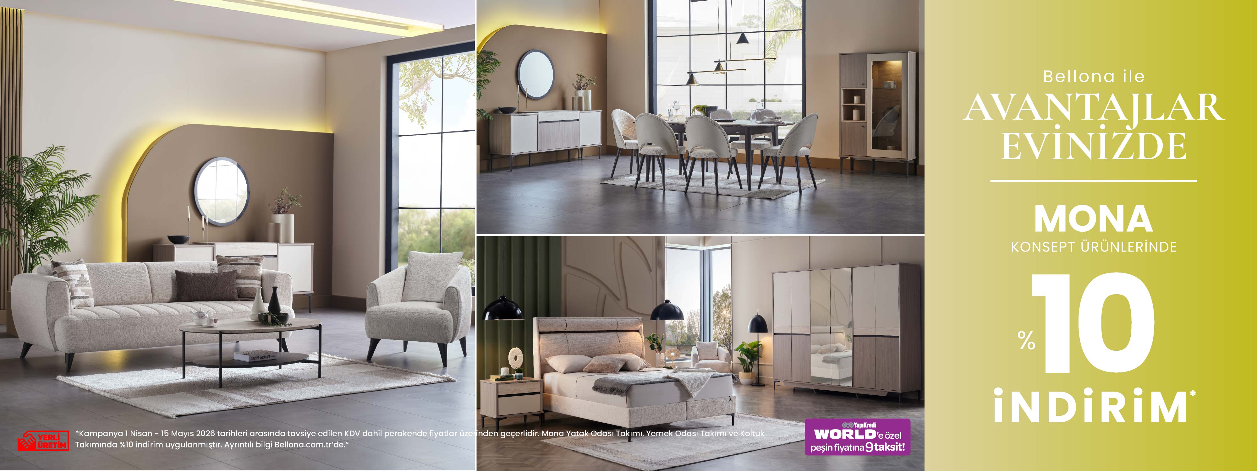 Kampanya 1 Nisan- 15 Mayıs 2026 tarihleri arasında tavsiye edilen KDV dahil perakende fiyatlar üzerinden geçerlidir. Fiyatı verilen Mona Düğün Paketi; Mona Yatak Odası Takımı (4 Kapaklı Gardırop, Makyaj Masası/Aynası, 150/160 cm Yatak Başlığı, 2 Adet Komodin), Mona Yemek Odası Takımı (Konsol, Alternatif Konsol Aynası, Sabit Yemek Masası, 4 Adet Sandalye) ve Mona Koltuk Takımından (Üçlü Koltuk, Berjer) oluşmaktadır.
