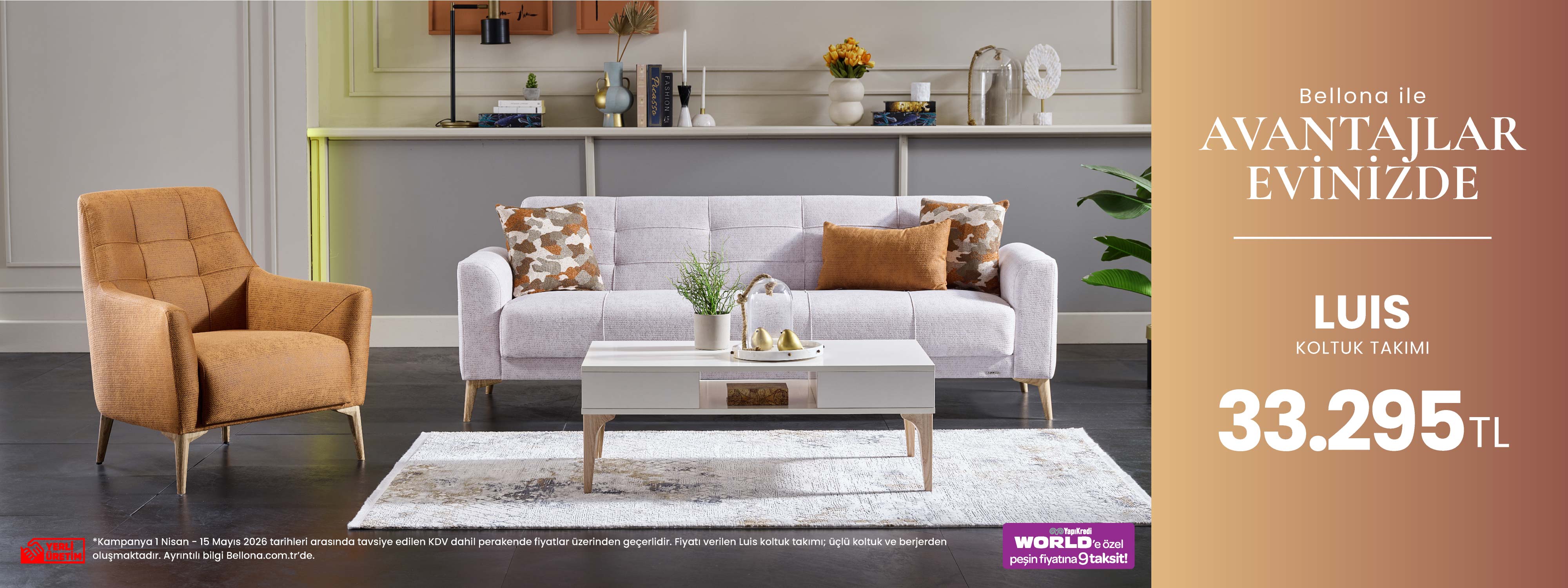Kampanya 1 Nisan - 15 Mayıs 2026 tarihleri arasında tavsiye edilen KDV dahil perakende fiyatlar üzerinden geçerlidir. Fiyatı verilen Luis koltuk takımı; üçlü koltuk ve berjerden oluşmaktadır.