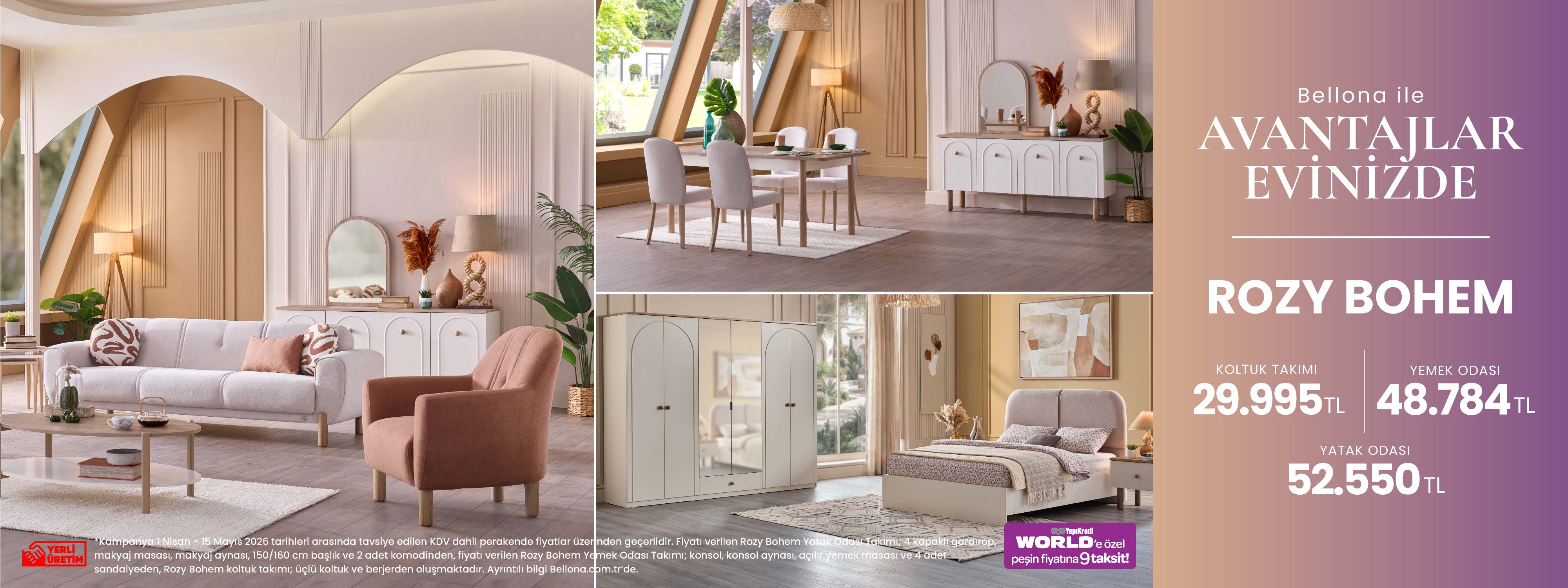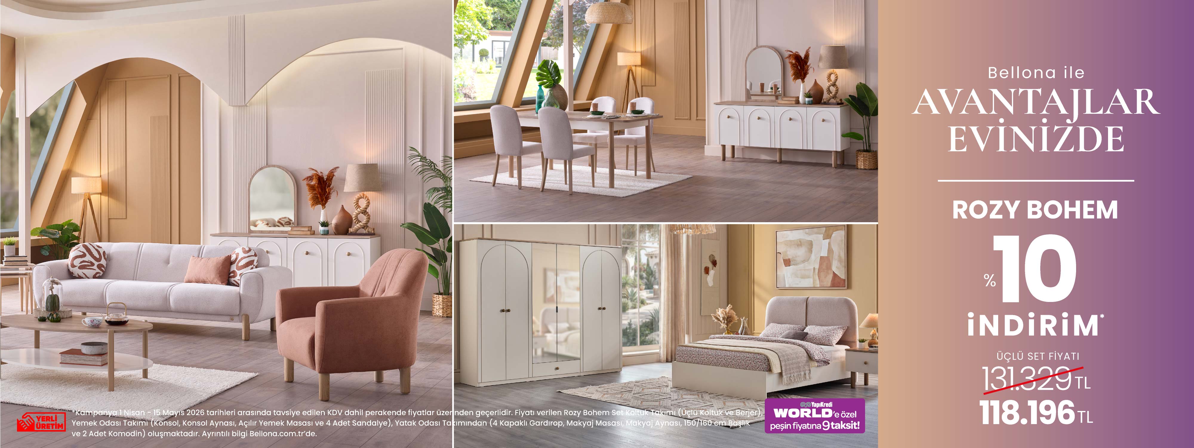 Kampanya 1 Nisan - 15 Mayıs 2026 tarihleri arasında tavsiye edilen KDV dahil perakende fiyatlar üzerinden geçerlidir. Fiyatı verilen Rozy Bohem Yatak Odası Takımı; 4 kapaklı gardırop, makyaj masası, makyaj aynası, 150/160 cm başlık ve 2 adet komodinden, fiyatı verilen Rozy Bohem Yemek Odası Takımı; konsol, konsol aynası, açılır yemek masası ve 4 adet sandalyeden, Rozy Bohem koltuk takımı; üçlü koltuk ve berjerden oluşmaktadır.