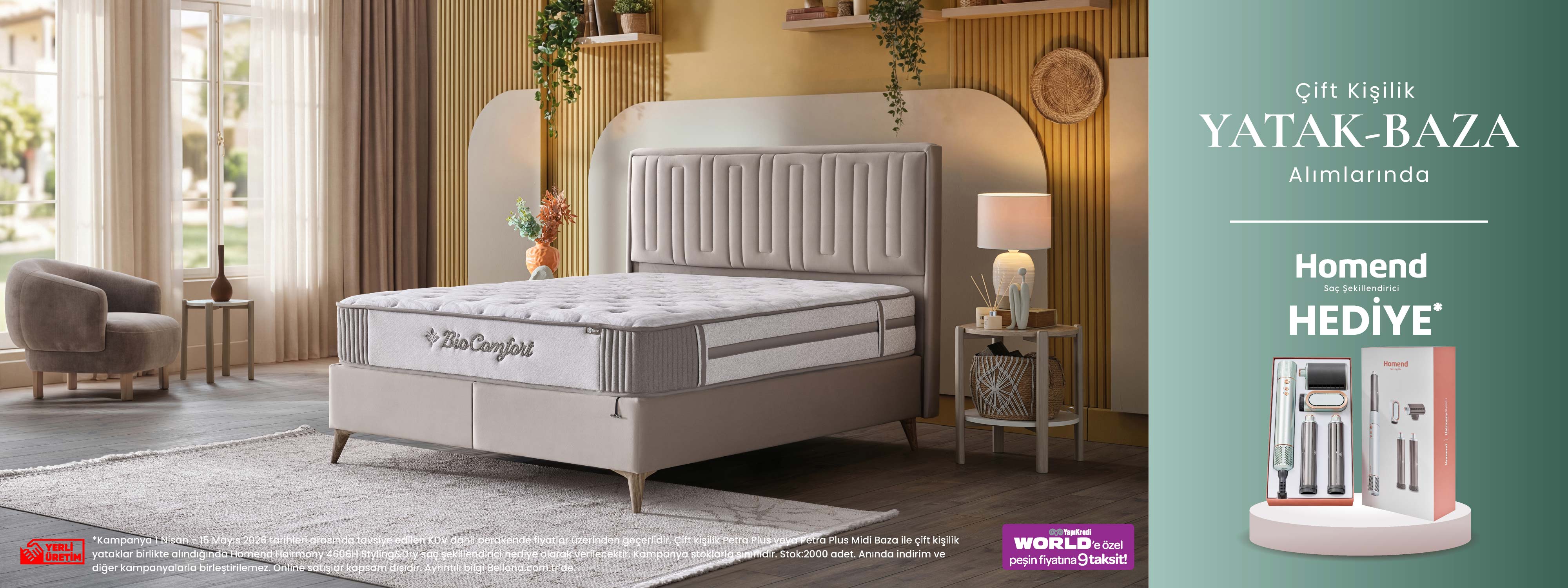 Kampanya 1 Nisan - 15 Mayıs 2026 tarihleri arasında tavsiye edilen KDV dahil perakende fiyatlar üzerinden geçerlidir. Çift kişilik Petra Plus veya Petra Plus Midi Baza ile çift kişilik yataklar birlikte alındığında Homend Hairmony 4606H Styling&Dry saç şekillendirici hediye olarak verilecektir. Kampanya stoklarla sınırlıdır. Stok:2000 adet. Anında indirim ve diğer kampanyalarla birleştirilemez. Online satışlar kapsam dışıdır.