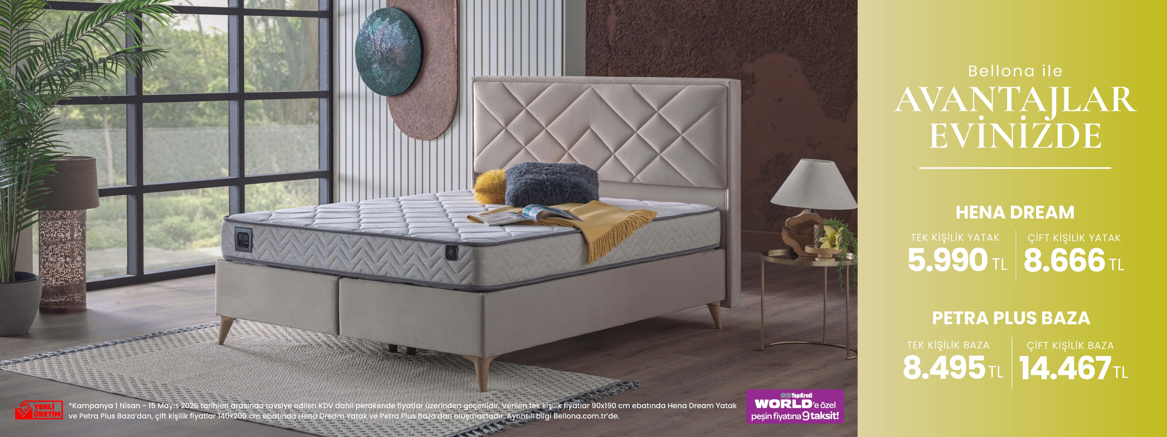 Kampanya 1 Nisan - 15 Mayıs 2026 tarihleri arasında tavsiye edilen KDV dahil perakende fiyatlar üzerinden geçerlidir. Verilen tek kişilik fiyatlar 90x190 cm ebatında Hena Dream Yatak ve Petra Plus Baza’dan, çift kişilik fiyatlar 140x200 cm ebatında Hena Dream Yatak ve Petra Plus Baza’dan oluşmaktadır.
