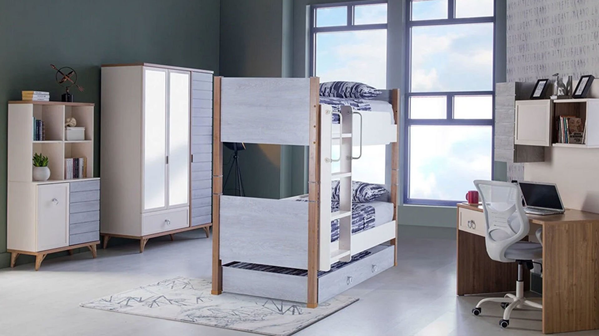 Hem kız hem erkek çocuklarının hem de daha üst yaş gruplarının uzun yıllar boyunca rahatlıkla kullanabileceği Mavenna, opak beyaz, meşe rengi ve mavinin şık bir kombinasyonu ile sizlere sunuluyor. Takımın genelinde kullanılan, temizliği kolaylaştırıcı yerden yüksek ayak tasarımı ile hijyenik bir kullanım deneyimi sunan bu model, E1 standartlarında, kanserojen madde içermeyen malzemeler ile üretilmiş olması ile de takdir görüyor. Takımdaki çok işlevli ürünlerden biri olan kitaplıklı çalışma masasını dilerseniz kitaplık ünitesi olmadan sadece çalışma masası olarak tercih edebilirsiniz.